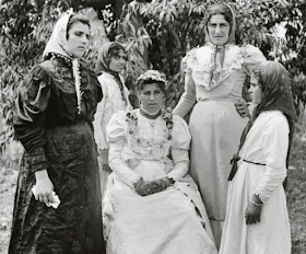 This photograph was taken sometime between 1900-1920 in Nazareth, and depicts an Arab Christian bride with her family. It is interesting to see that all the women are wearing Western-style dresses, perhaps under the influence of missionary schools. The bride's hands are elaborately hennaed to the wrist with a checkered pattern from strings, and another young woman in the photo (most likely her sister) has fingers hennaed with a simpler resist in the same style... Just as described by Rogers and Jaussen! It is so rare to find confirmation of a particular style of henna patterning from both text and photographs, and so this is a very special case.